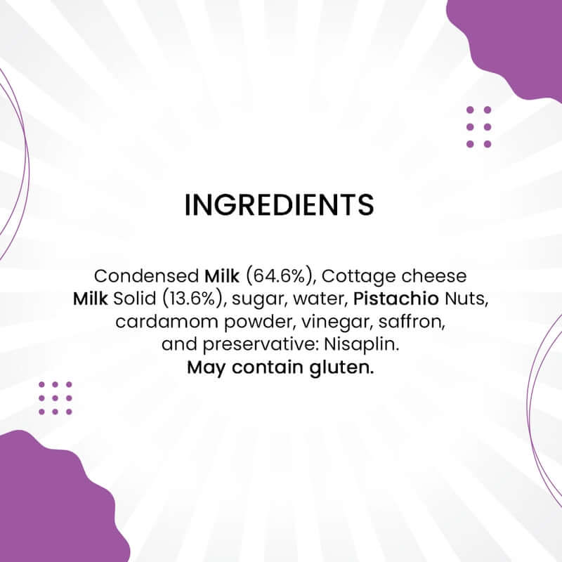 Indulge in the rich flavours of Kesar Rasmalai by Haldiram's UK. Crafted with care, this dessert combines condensed milk, cottage cheese, and milk solids, sweetened perfectly with sugar and water. Enhanced with the delicate aroma of cardamom powder and the warmth of saffron, it's a treat for the senses. Each bite offers a delightful crunch of Pistachio Nuts, adding a nutty twist to the creamy goodness. Made for those who appreciate authentic flavours, this dessert captures the essence of tradition in every spoonful. Enjoy the comforting taste of home with Haldiram's Kesar Rasmalai. *May contain gluten.